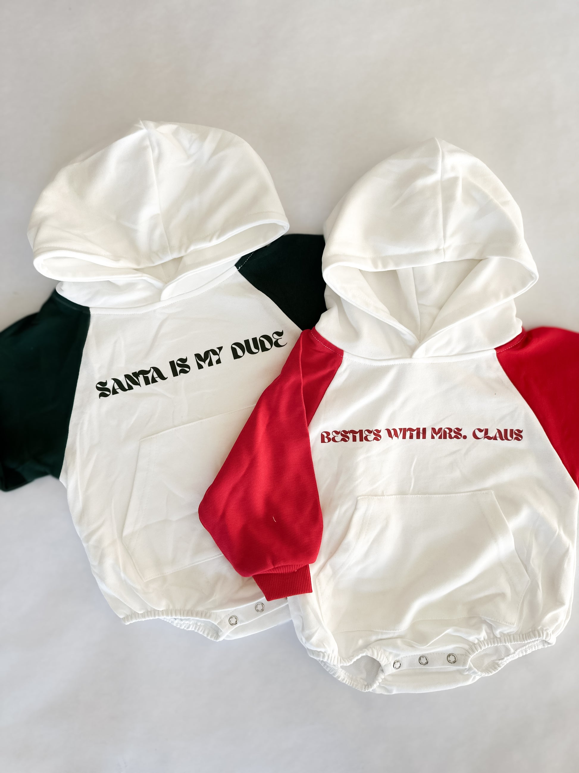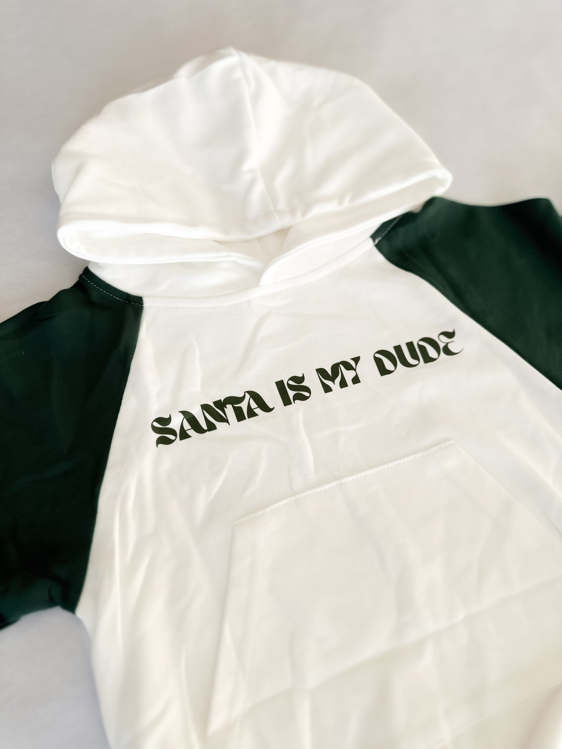 The Santa’s My Dude Bubble Romper brings laid-back holiday fun to your little one’s wardrobe. With a soft white bubble body, cozy hood, and vibrant green sleeves, it’s designed for comfort during every winter adventure. The playful “Santa’s My Dude” graphic adds the perfect touch of Christmas personality. Cute, cozy, and ready for all the merry moments of the season.